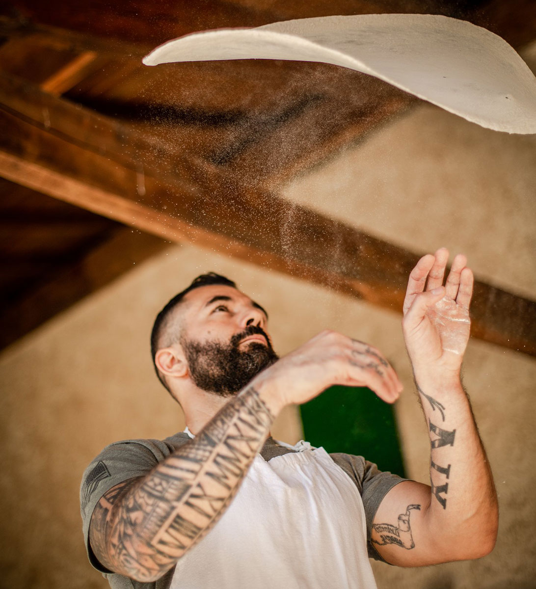 qui ne se laisse pas dompter en gardant une âme libre et sauvage. Il est la représentation de la sagesse et de la force, accompagné de sa meute, sa famille. C’est avec cet état d’esprit que Julien crée sa vision de la pizza street food : respecter les traditions tout en s’accordant la liberté de créer des plats pouvant être mangés indépendamment du lieu et de l’instant.